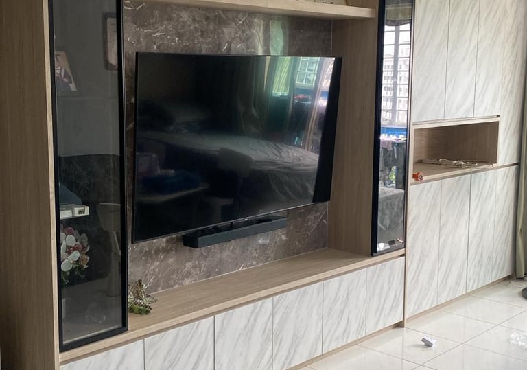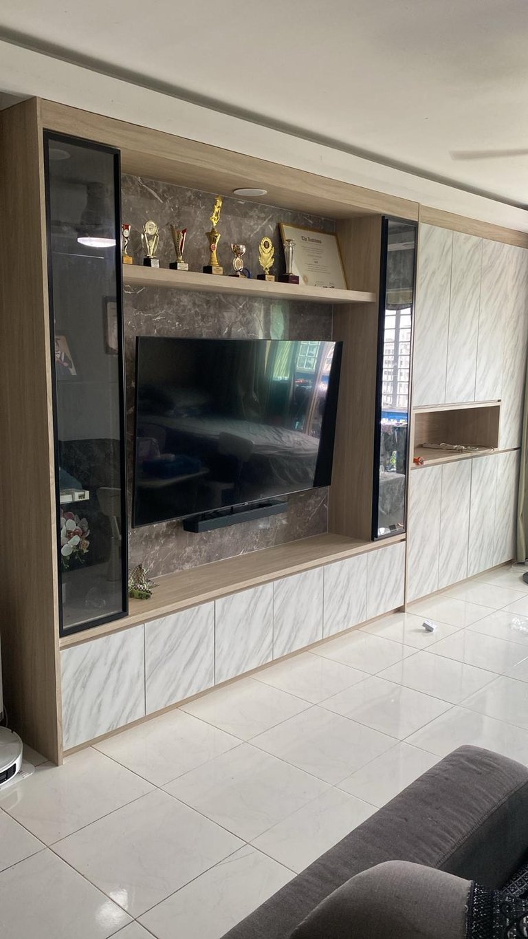 During the site visit, we will calculate the dimensions required to construct this comprehensive living room TV console, featuring glass cabinets on both sides of the television.