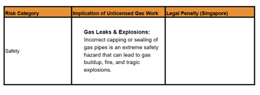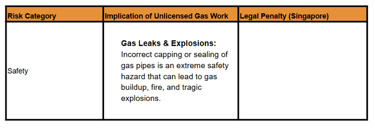 | N/A (Safety Incident) | | Carbon Monoxide Poisoning: Improper installation or disconnection of gas appliances can lead to the silent, odourless release of Carbon Monoxide. | N/A (Safety Incident) | | Legal | Offence under the Gas Act: Only a Licensed Gas Service Worker (LGSW) registered with the EMA is permitted to carry out work on gas service pipes. | Fine up to S$10,000 or imprisonment up to 12 months, or both for failing to comply with inspection and maintenance responsibilities under the Gas Act. | | Compliance | Voided Warranty/Insurance: Work performed by an unlicensed person may void your home insurance policy in the event of a gas-related incident. | May affect insurance claims.