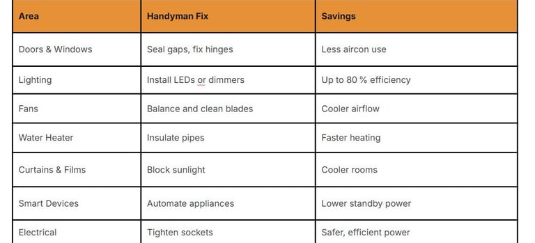 Small home fixes can make a big difference! From sealing air gaps and cleaning fans to installing LEDs or smart plugs — Lets handyman.sg help you save more every month. Discover how simple upgrades lead to real savings 👇 👉 www.handyman.sg