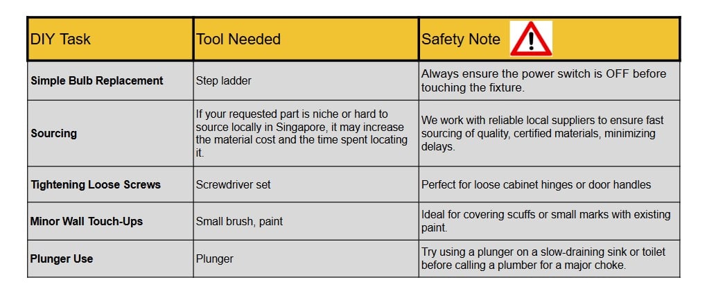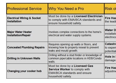 The following tasks pose a significant risk of injury, damage to your property, or require licenses and specialized knowledge to comply with Singapore regulations: