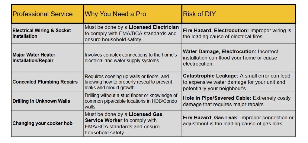 We believe every Singapore homeowner should feel empowered to handle small, safe fixes. However, there are critical moments when calling a professional is not just recommended, but a necessity for safety and compliance.