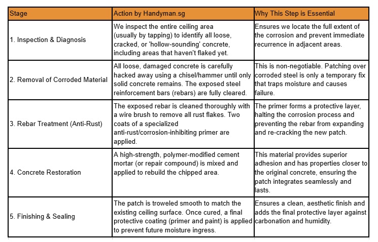 Spalling concrete is not a DIY job. A proper, lasting repair requires specialized materials and adherence to a strict professional process to treat the underlying corrosion. Here is the step-by-step method Handyman.sg uses to ensure a permanent fix:
