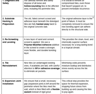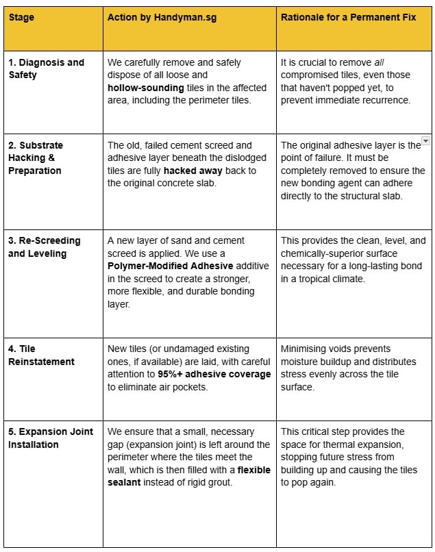 A permanent repair is not about gluing the loose tiles back down; it's about treating the underlying stress and adhesion failure. Handyman.sg follows a systematic approach to ensure the repair lasts.