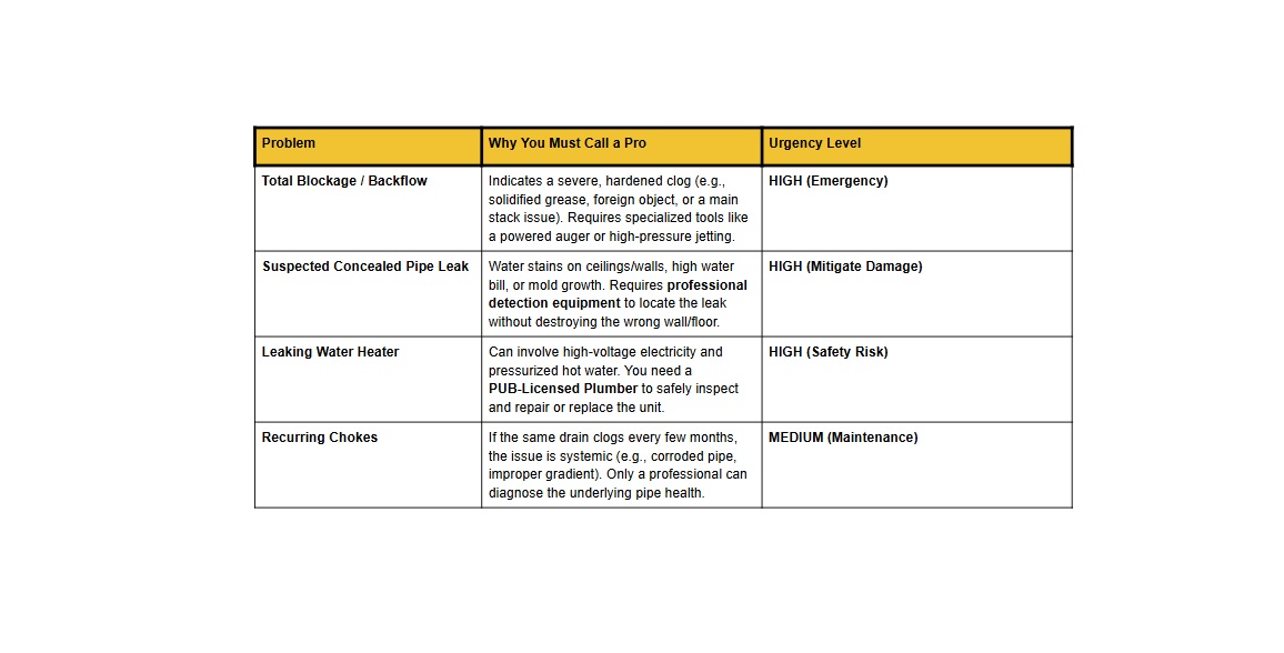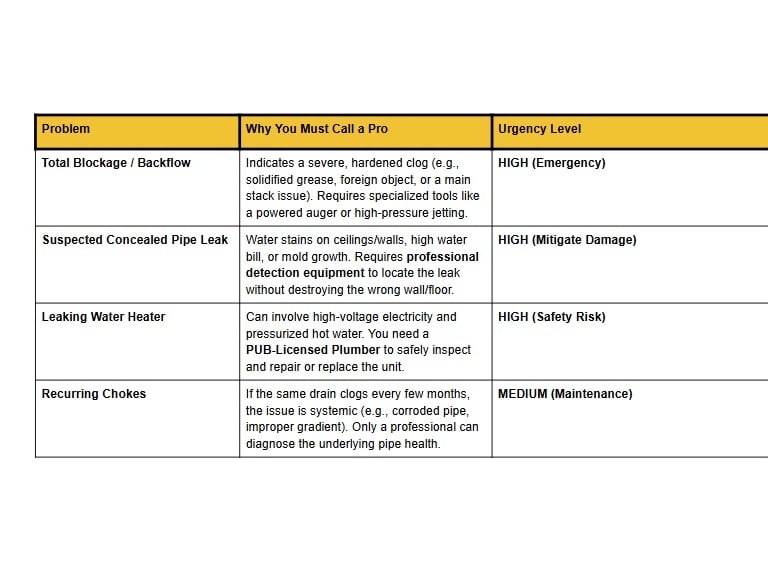 Most plumbing issues start small. Knowing when you can safely handle a clog and when you need to bring in a PUB-licensed professional is the key to saving money and preventing major water damage.